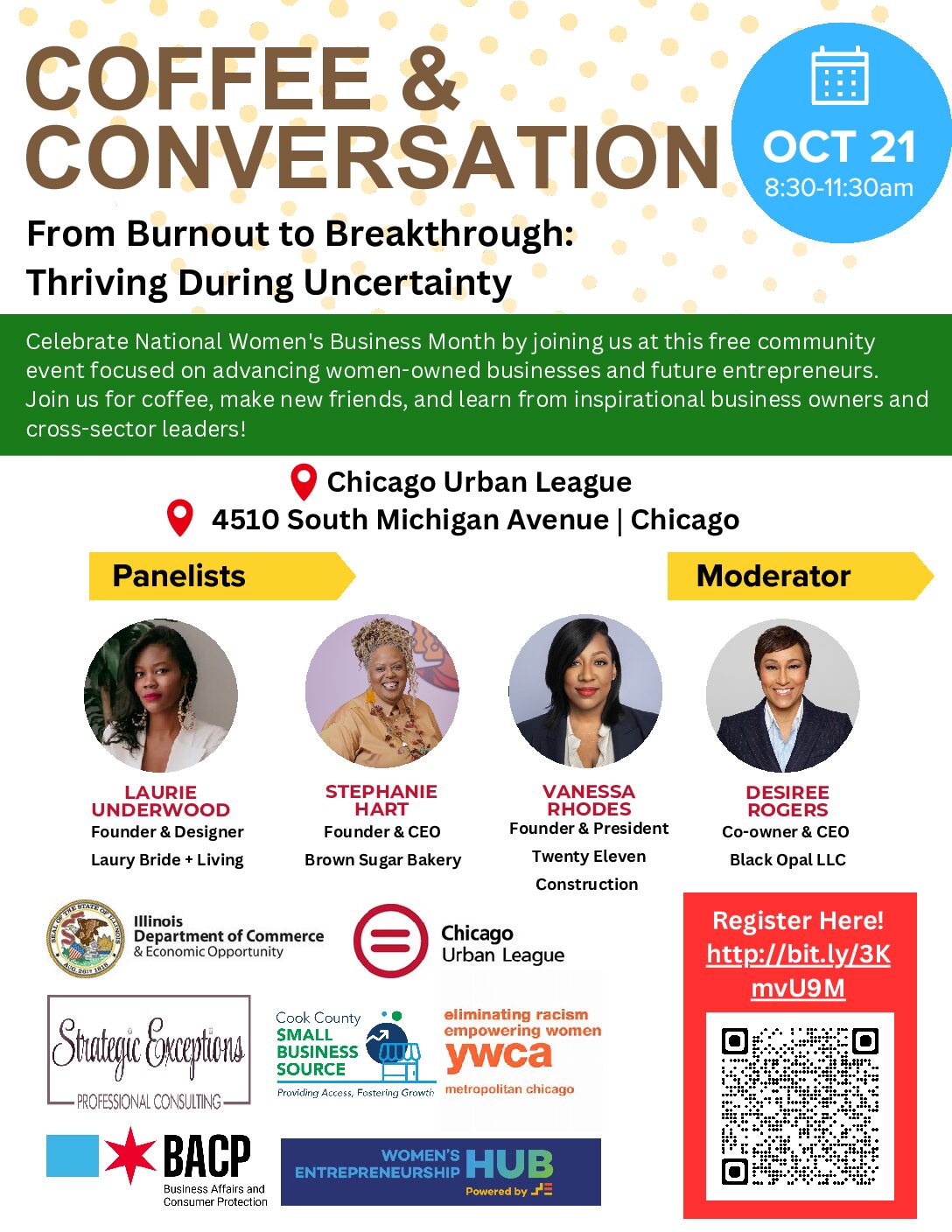 Join us on Monday, October 21st, from 8:30–11:30 AM at the historic Chicago Urban League for a free community event designed to uplift women entrepreneurs and aspiring business owners.